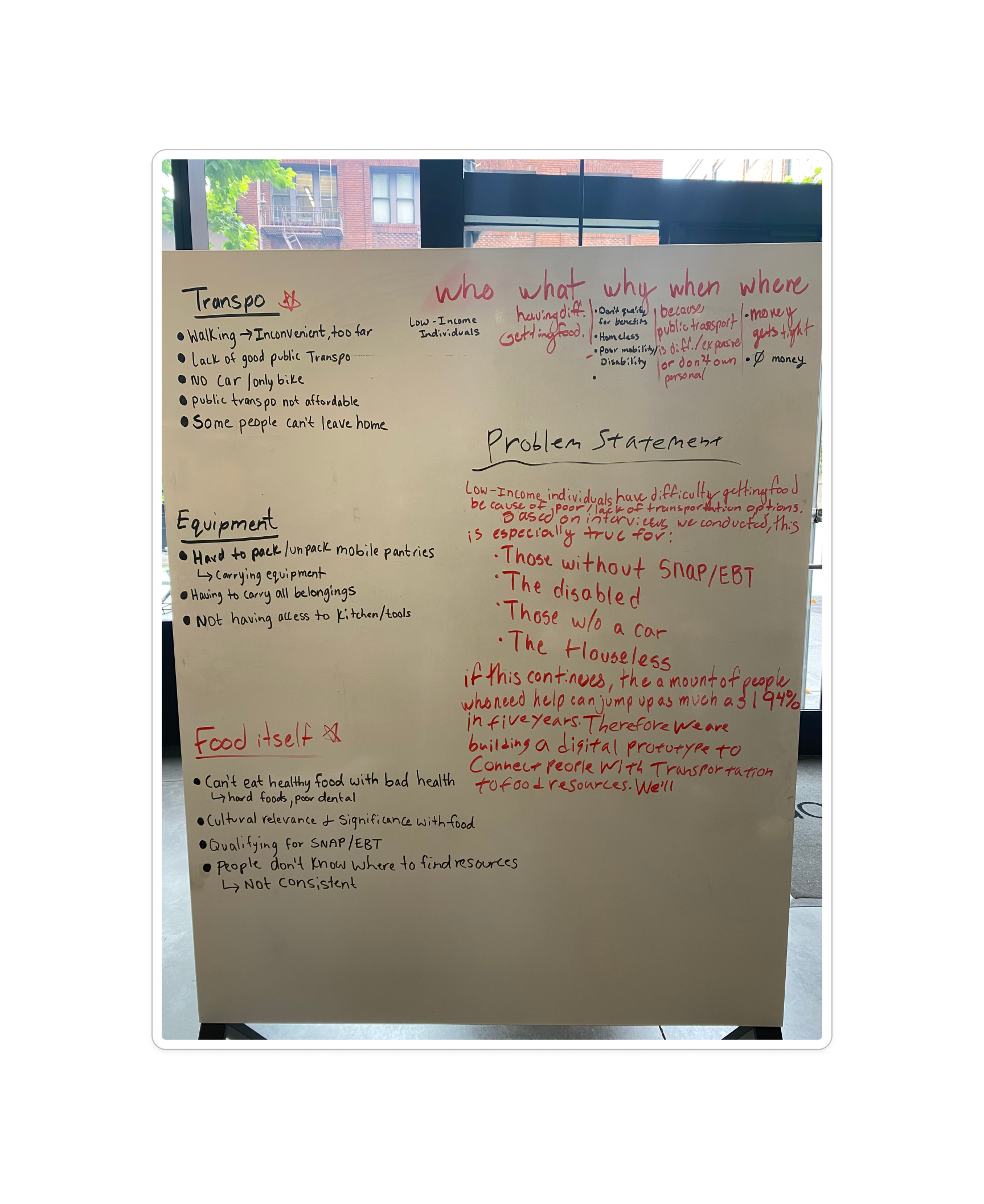 Using Secondary Research, we began looking into how and where food insecurity affects the Bay Area. Through this research, we were able to identify several obstacles that prevent people from getting the food they need, money, equipment, and transportation.